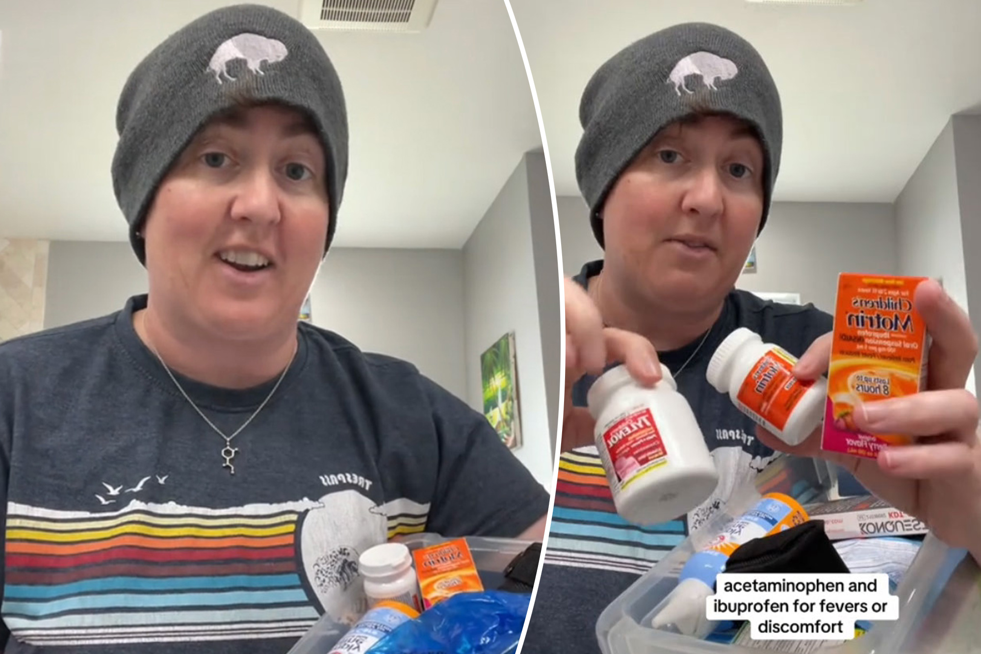 She said the box should contain acetaminophen and ibuprofen for fever and discomfort.